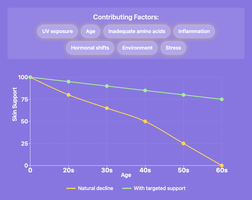Skin firmness, lift, and even tone depend on a connective tissue framework made from collagen, amino acids, and minerals. Over time, breakdown can outpace rebuilding.