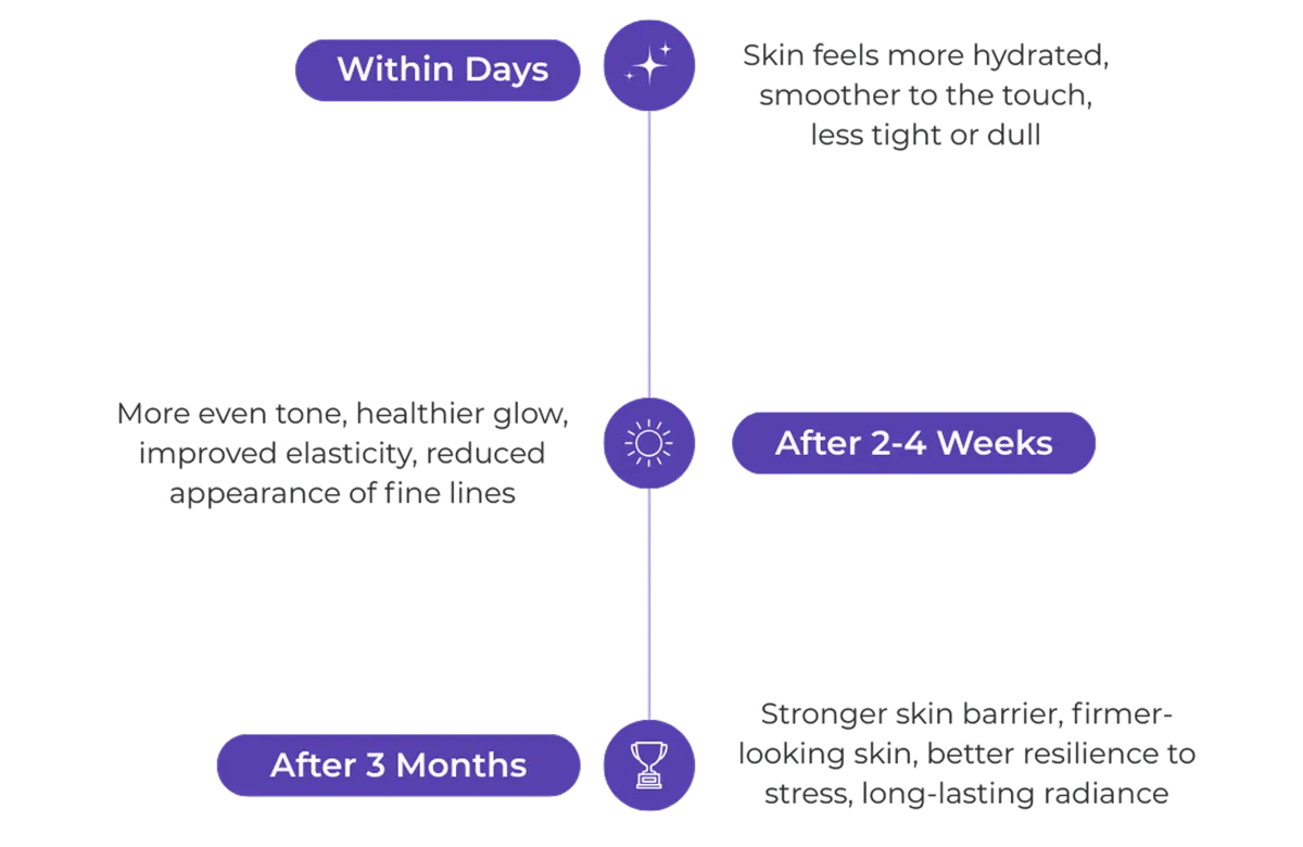 Skin structure depends on consistent input, not short cycles. Using it regularly supports ongoing maintenance of collagen fibres and connective tissue integrity, rather than temporary cosmetic effects.
