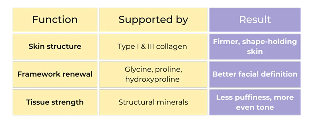 This formula provides a daily supply of structural building blocks that support how skin maintains its shape, density, and resilience over time.